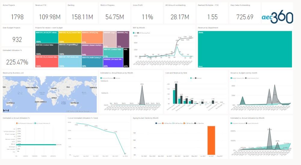aec360 Project Manager dashboard consists of key KPIs of Project like contract value, Revenue, Backlog, Work in Progress ,Gross profit percentage, AR outstanding amount, days for outstanding payment,Active projects and utilization and Realization multipliers.