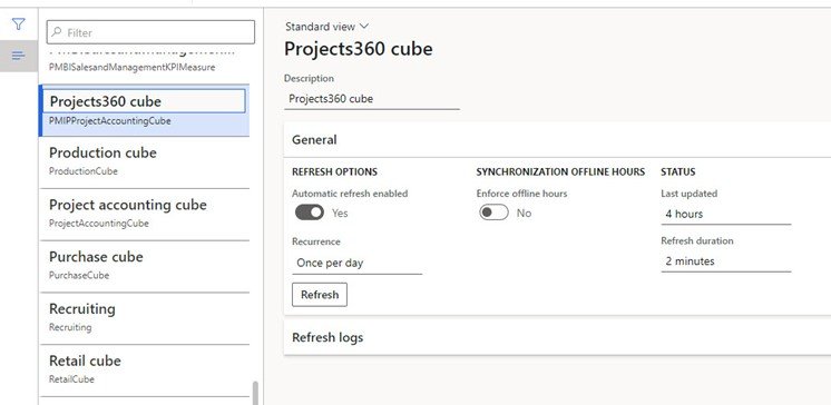 System administration > Setup > Entity store > Scroll to Projects360 cube in the list of measures