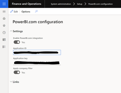 1. In the Finance and Operations client, open the PowerBI.com configuration page.