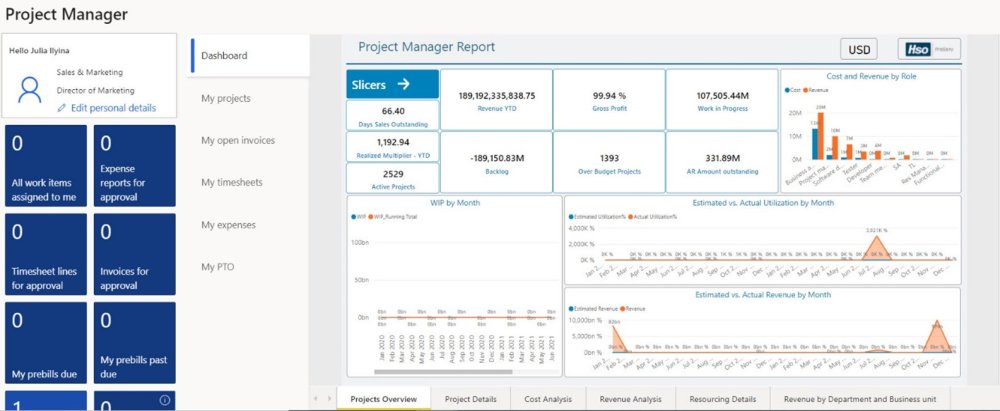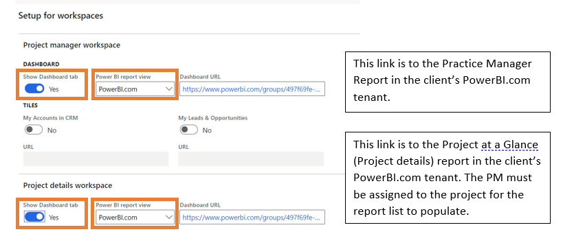 - HSO ProServ recommends leveraging PowerBI.com to display the Project Manager Report and Projects at a Glance: Changes made to these reports in PowerBI.com will be reflected in the Project manager workspace. If using Power BI embedded, changes to these reports will require development.