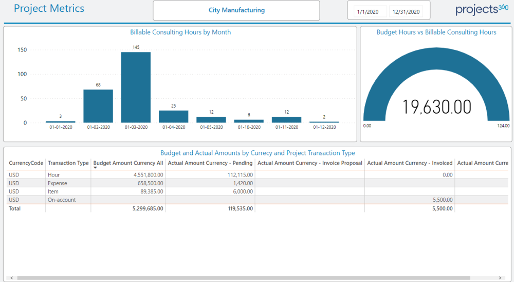 This will give the overall view of the selected project, this consist of month on month trend on billable consulting hours and a table showing project transaction type wise budgeted and actual amounts.