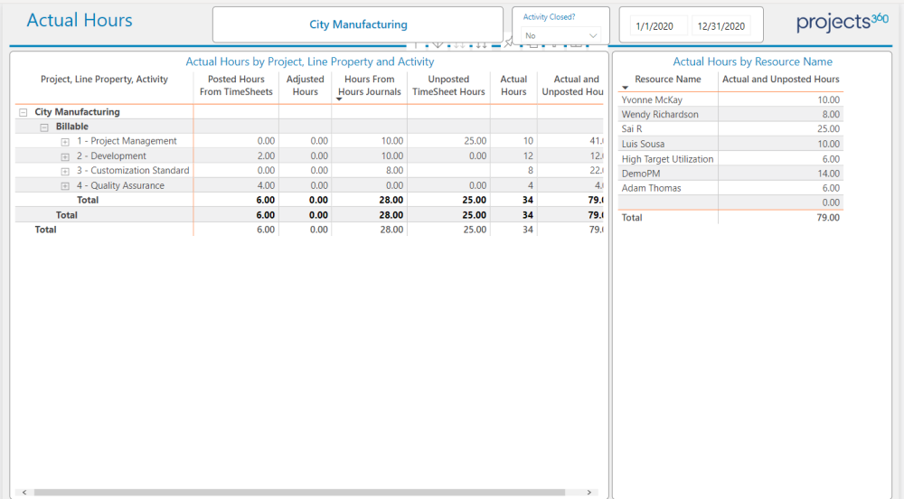 Here uses can see the Actual hours like posted,unposted,Adjusted and hours from hours journal in various hierarchy. here the user can drill down by project level to WBS levels. their is a table showing actual and unposted hours by resource as well.