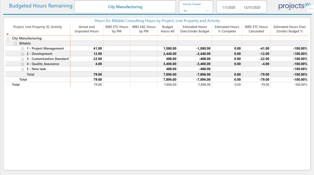 Here uses can see the budgeted hours remaining like actual and unposted hours ,Estimated hours % complete, WBS ETC hours calculated , ETC/EAC hours and estimated hours over/under budget % in various hierarches (Project, Line Property ID, Activity)