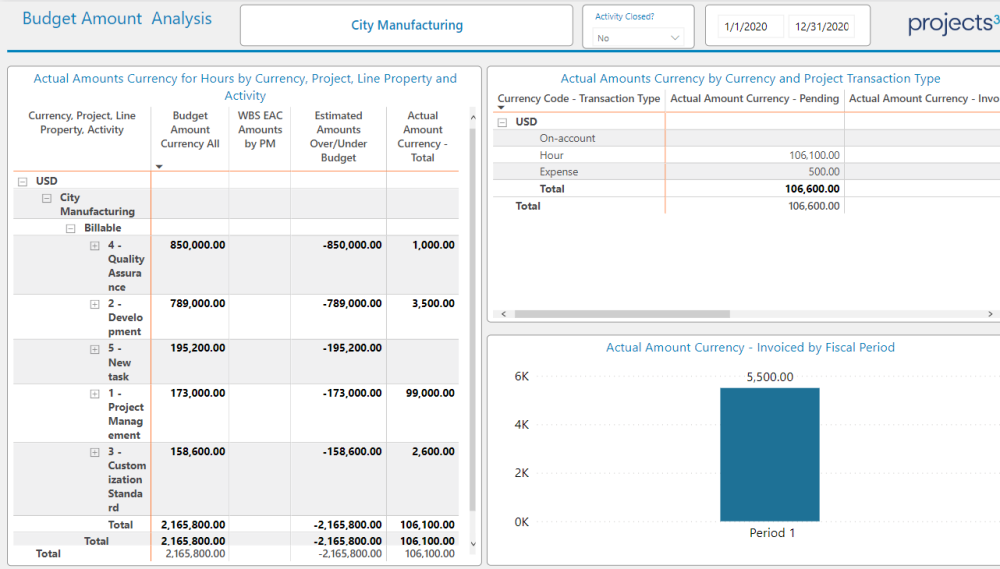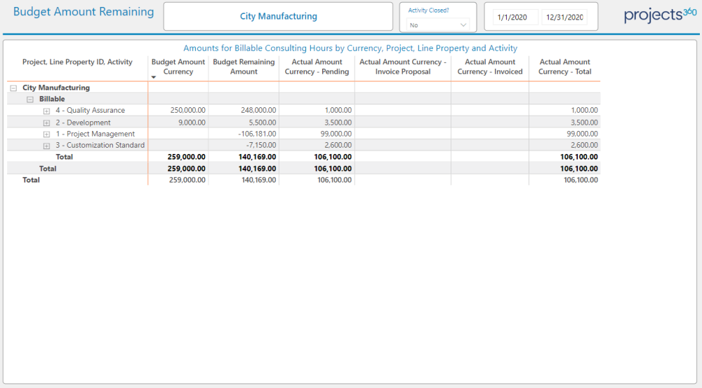 Here uses can see the budgeted amount remaining and actual amount currency pending, amount currency invoice proposal , amount currency invoiced , amount currency total by various hierarches (Project, Line Property ID, Activity)