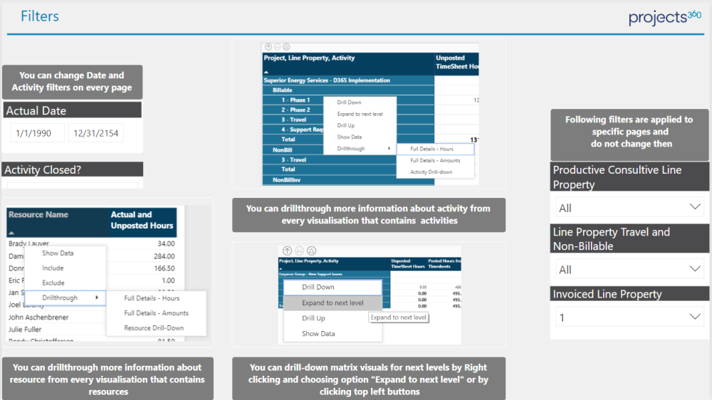 Here uses can have drill through experience to see more details by projects and Resource.