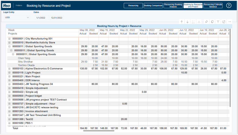 Booking By Resource and Project: It shows the comparison between Actual Hours and Resourcing hours of all resources for every week.