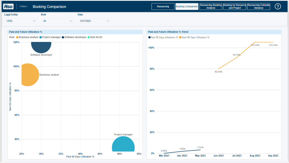 Booking Comparison: It gives an idea about the Past Utilization % and future utilization % on based on resource role which will be helpful in project budget.