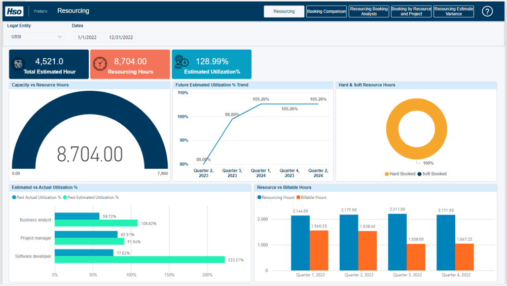 Resourcing Booking Analysis: It shows the comparison between the actual hours and capacity hours and shows estimated utilization percentage based on the resource role. It helps in optimizing the resource forecasting process and improving the resource utilization resulting in reduced project cost.