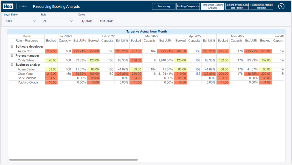 - Actual Booked Hours by Resource Vs. Billable hours booked by resource.