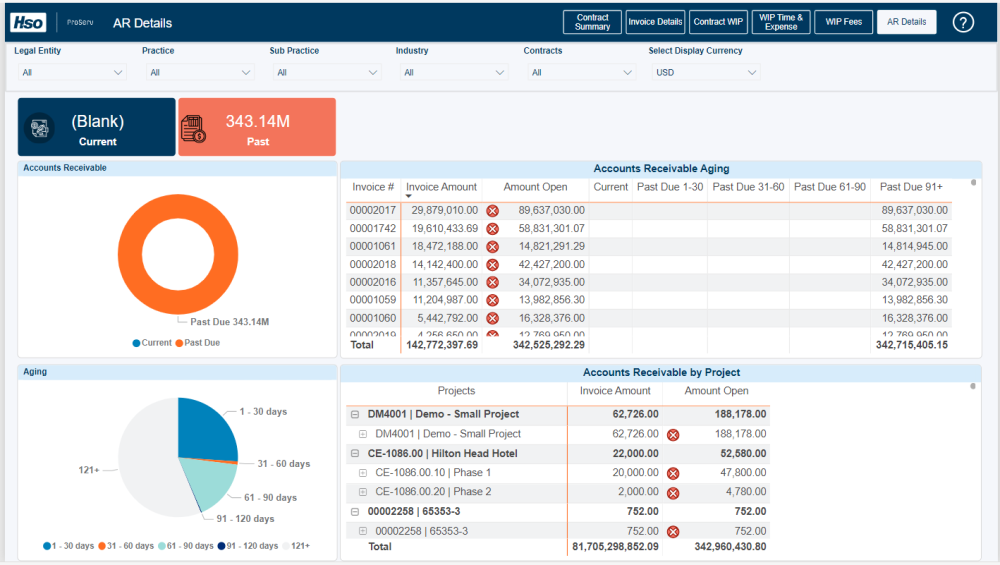 AR details tab consists of information of Invoice amount, Open amount by invoice number and by project.