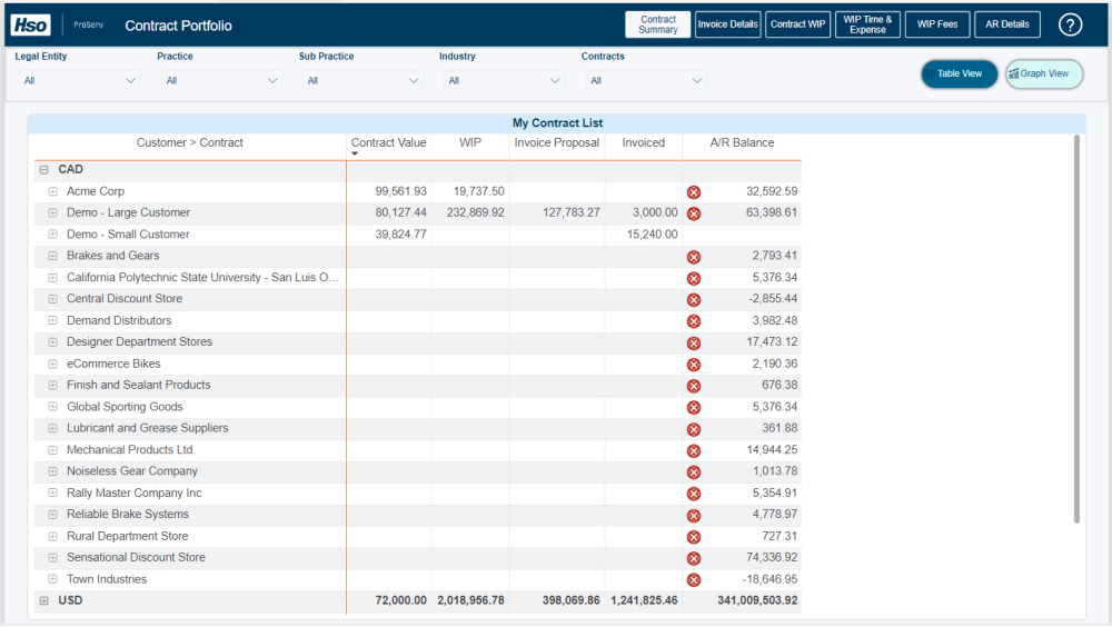 Table view of Contract Portfolio has detailed information of the contract list showing KPIs such as Contract value, Invoiced and AR balance.
