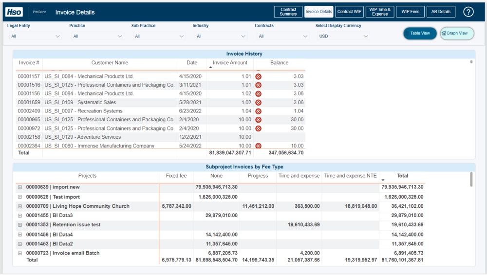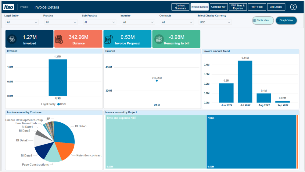 Invoice details: The Invoice Details tab provides organizations with a comprehensive report that enables them to understand the invoiced amount and outstanding balances for each customer. This report offers valuable insights into customer billing at the project level, facilitating effective tracking and management of invoicing activities. Project managers and finance teams can easily track the invoicing status and identify any outstanding balances. This information is crucial for managing cash flow, optimizing revenue collection, and maintaining healthy customer relationships.
