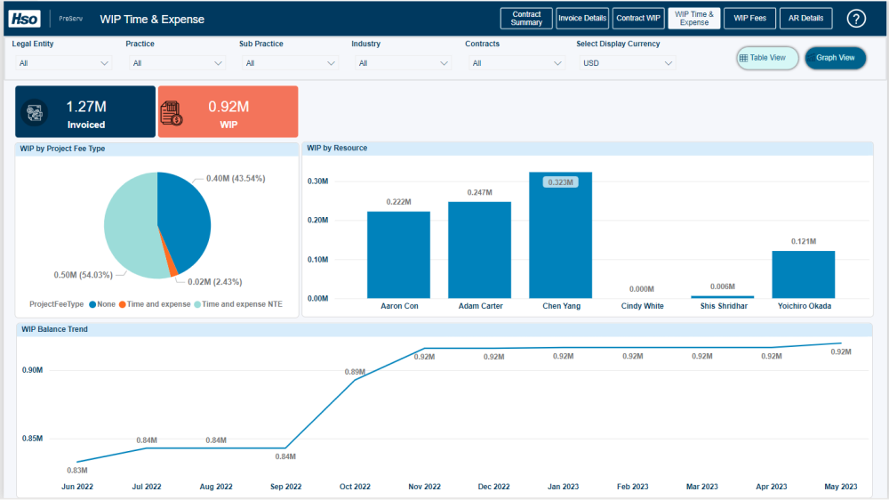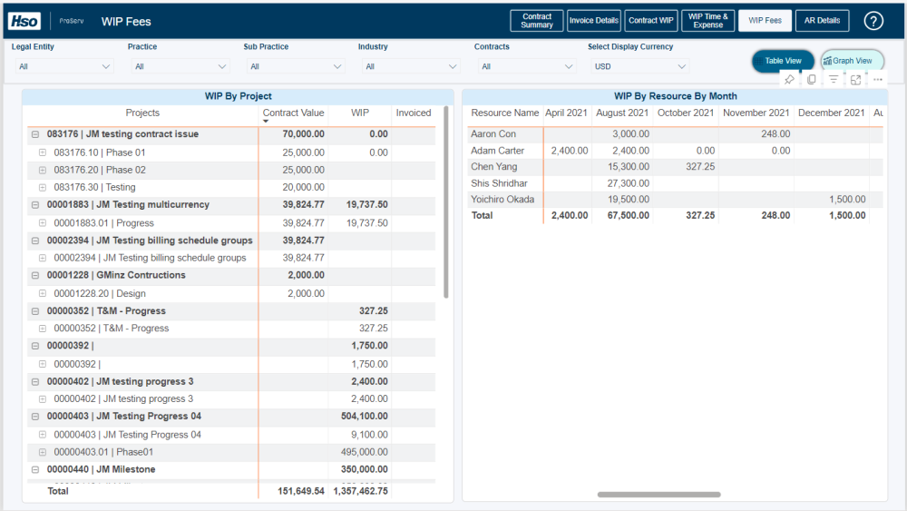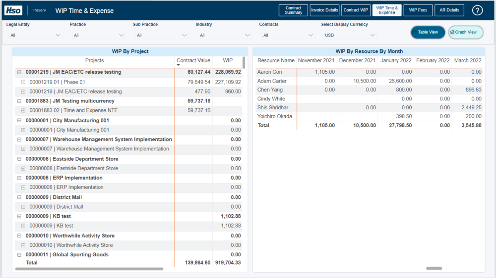 Table view of WIP Time and Expense consists of information of amount by project and by resource which are in WIP for the projectfeetype ‘time and expense’ and ‘time and expense NTE’.