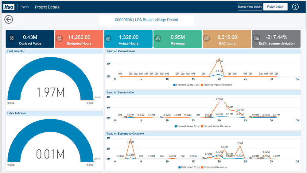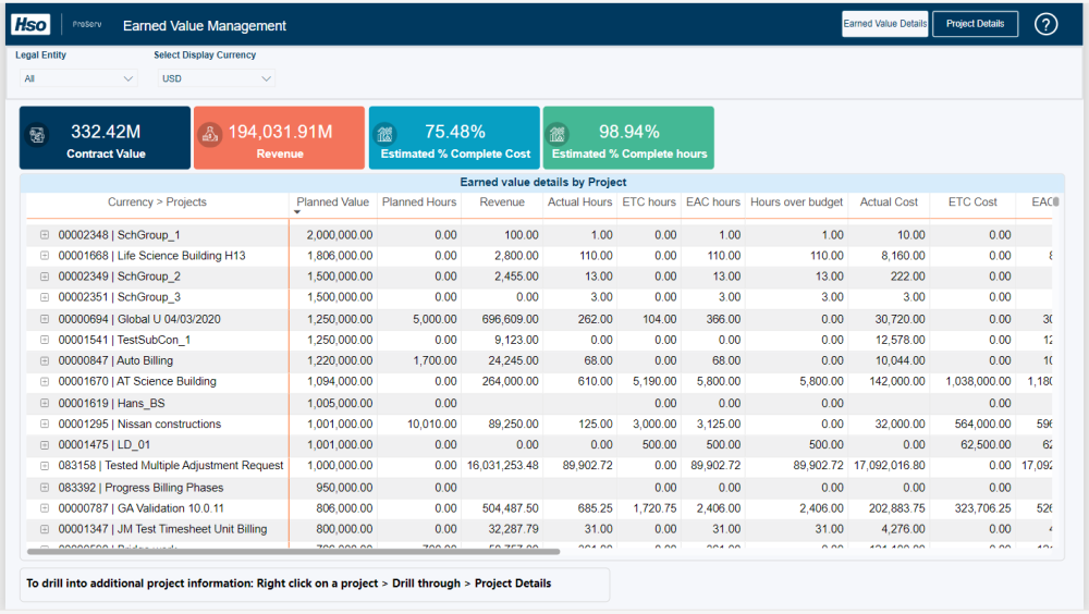 Here user can see details for selected project by using drill through from Earned value management tab.