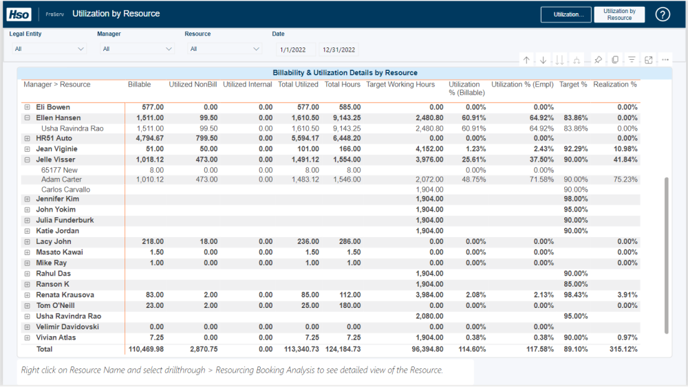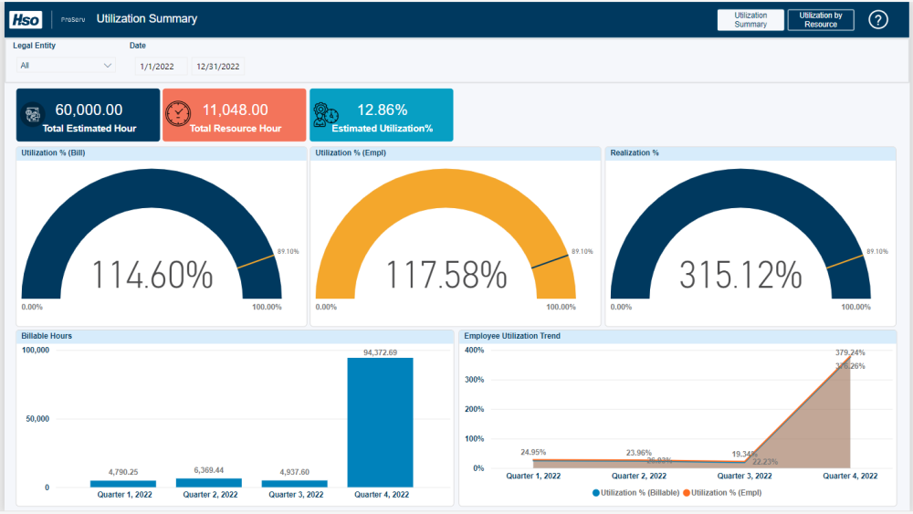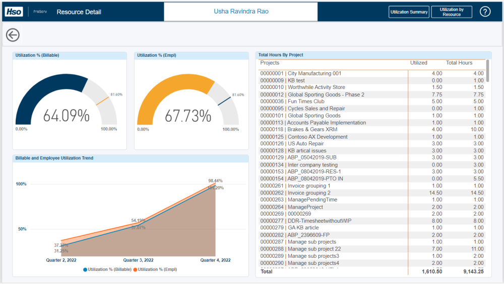 Utilization Summary: It provides insight on resource billable utilization percentage, utilization % for all employee, realization % in terms of utilization of resource, total billable hours (posted + unposted) and comparison between (Utilization % (billable), Utilization %(Empl)).