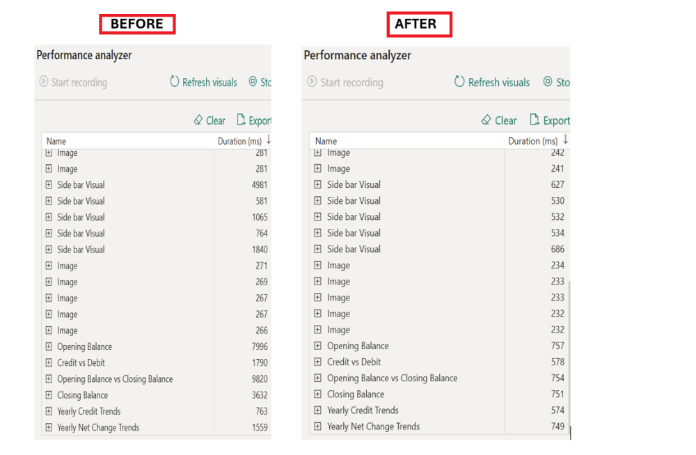 The General Ledger Analysis Report has been enhanced to improve performance and overall usability. Initially, a performance analysis was conducted to evaluate report load times and visual efficiency. Based on the analysis results, key visuals such as image, Visuals, Opening Balance & Closing Balance related metrics were identified as contributing to higher load times. After optimization, the report performance improved by approximately 61% , resulting in faster rendering and improved responsiveness, and a smoother user experience.