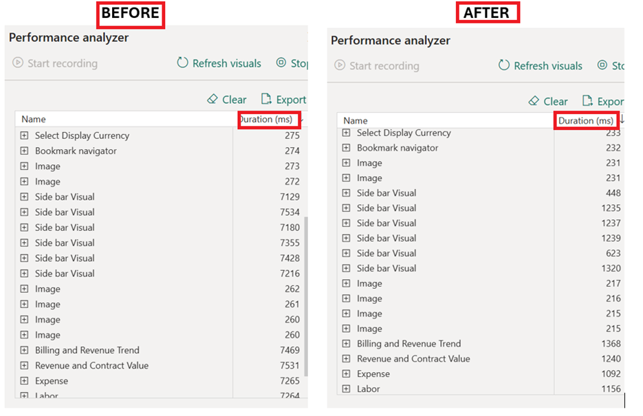 The Contract Portfolio report has been optimized for better performance and usability. A detailed analysis identified visuals such as Billing, Revenue, and related metrics as contributors to longer load times. After applying targeted improvements, report performance increased by approximately 82%, resulting in faster rendering, improved responsiveness, and a smoother user experience.