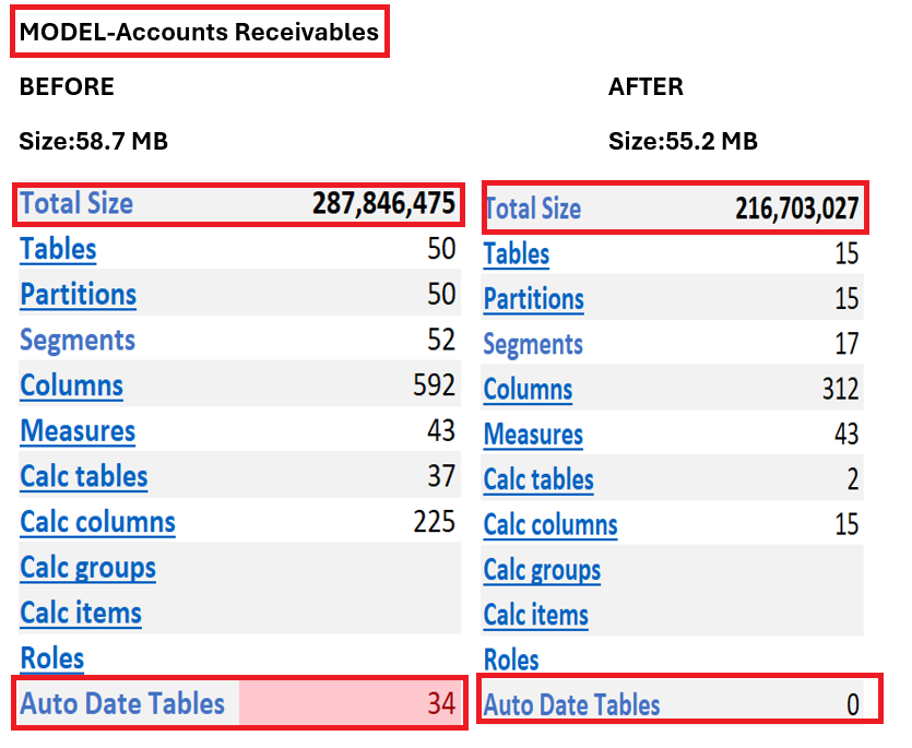 Performance improvement in the Accounts Receivable data model was achieved by reducing the dataset processed by the model from 287 million units to 216 million units, representing an approximate 24 % improvement for faster report loading and smoother interactions.