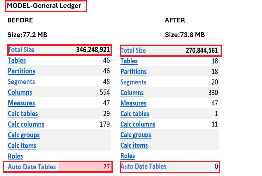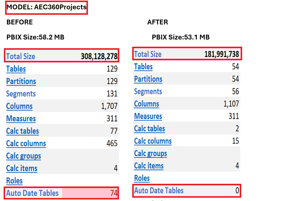 As part of release 10.0.46, performance improvements were implemented in the Accounts Receivable, General Ledger, and Projects data models to enhance report loading time and query execution efficiency. The optimization was validated through structured before-and-after analysis using DAX Studio and VertiPaq Analyzer to assess internal engine behavior. In the initial version, the Auto Date Table feature was enabled, creating system-generated date hierarchies and hidden objects that increased model size and query overhead. In the optimized version, the Auto Date Table feature was disabled, reducing unnecessary date hierarchies and improving overall model structure.