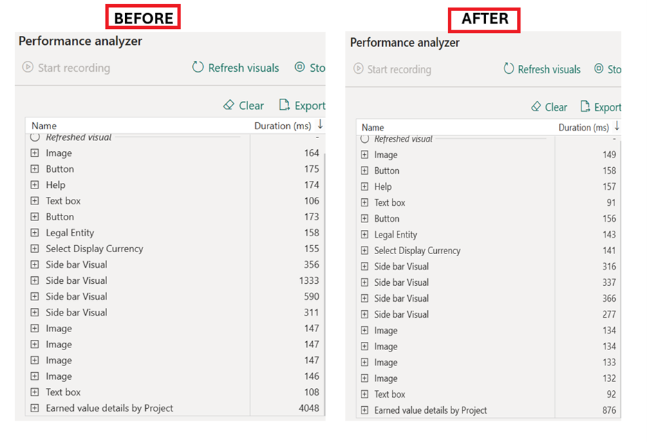 The Earned Value Management Report has been enhanced to improve performance and overall usability. Initially, a performance analysis was conducted to evaluate report load times and visual efficiency. Based on the analysis results, key visuals such as image, Visuals, Earned Value related metrics were identified as contributing to higher load times. After optimization, the report performance improved by approximately 74%, resulting in faster rendering and improved responsiveness, and a smoother user experience.