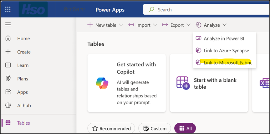 2. Select the environment > select Tables on the left navigation pane, and then select Analyze > Link to Microsoft Fabric on the command bar.