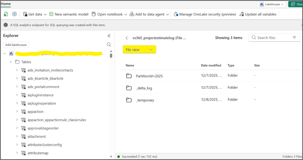 - File view: Displays how Dataverse tables are stored internally in OneLake as Delta files and Folders.