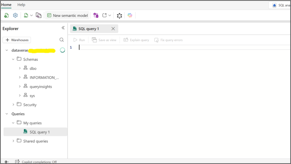 7. Selecting a SQL Analytics endpoint will open a SQL workspace to query Dataverse tables.