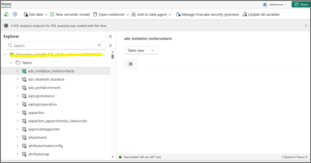 - Table view: Contains Dataverse tables. These are stored in Delta Format in OneLake.