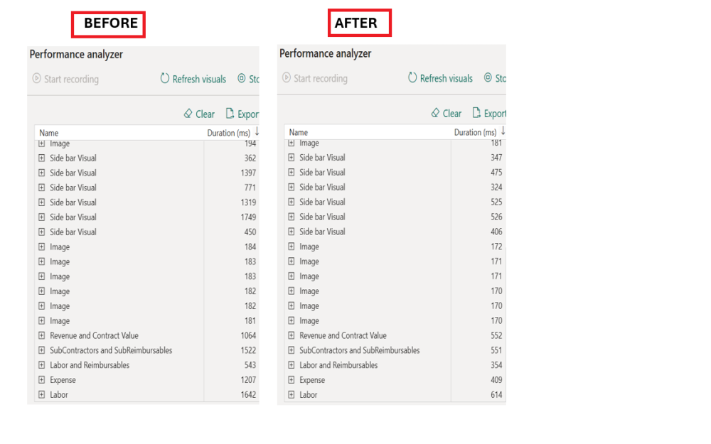 The Contract Management Report has been enhanced to improve performance and overall usability. Initially, a performance analysis was conducted to evaluate report load times and visual efficiency. Based on the analysis results, key visuals such as image, Visuals, Revenue and Contract values related metrics were identified as contributing to higher load times. After optimization, the report performance improved by approximately 53%, resulting in faster rendering and improved responsiveness, and a smoother user experience.
