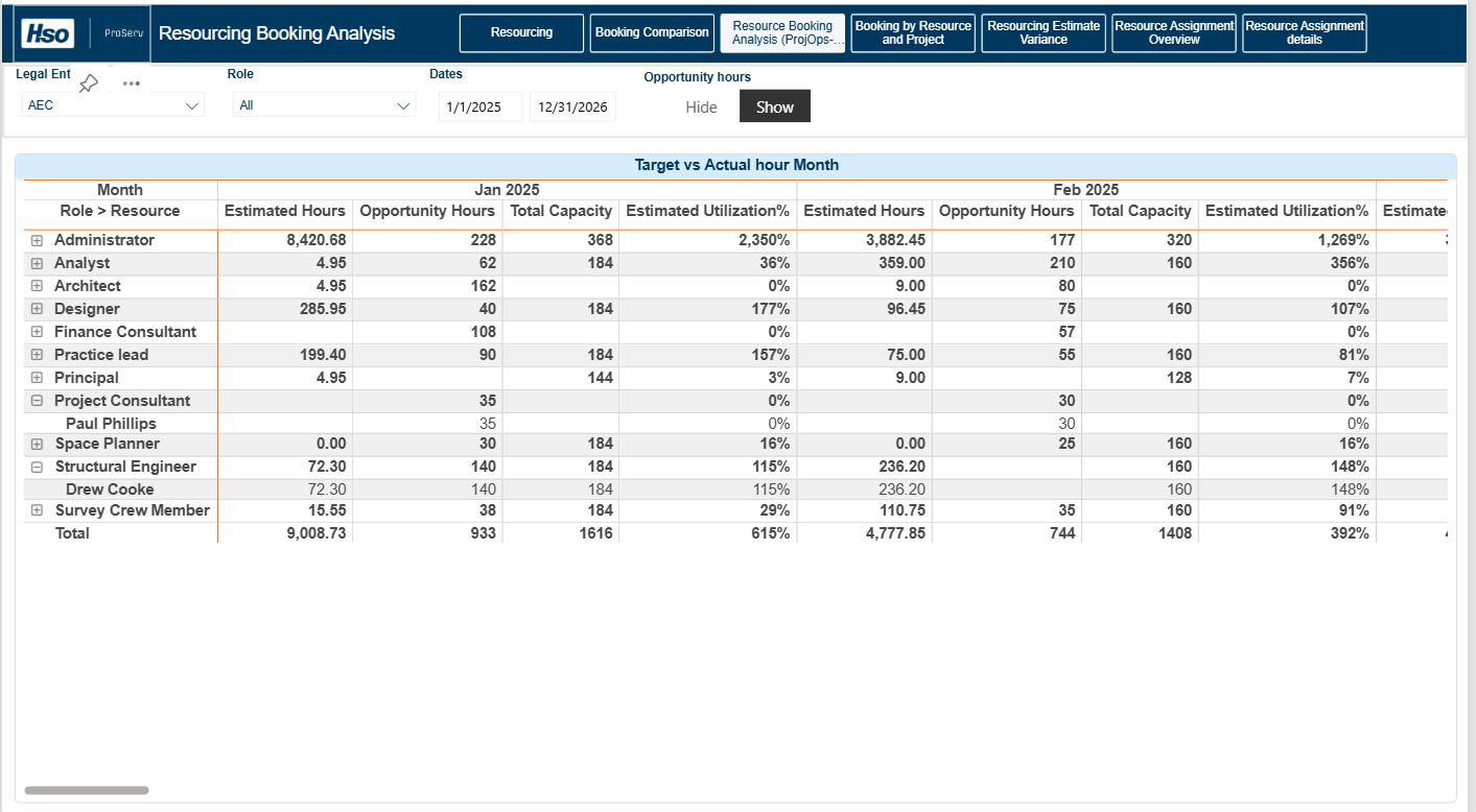 - Show: Estimated Utilization% incorporates both confirmed bookings and opportunity hours, offering a forward-looking perspective.