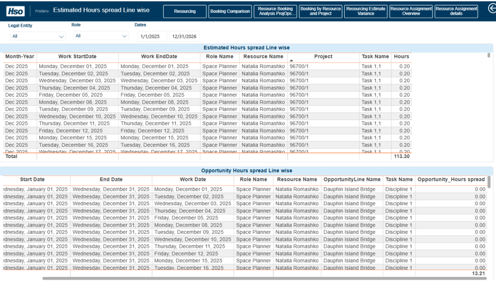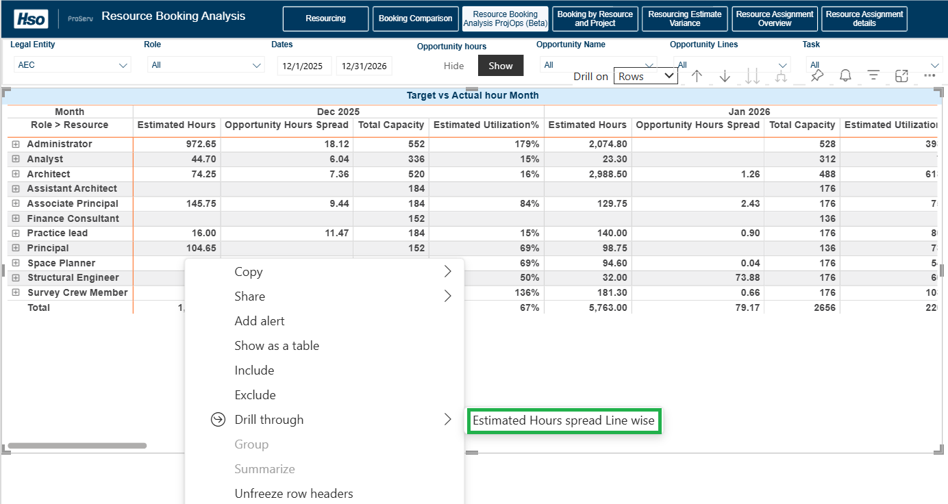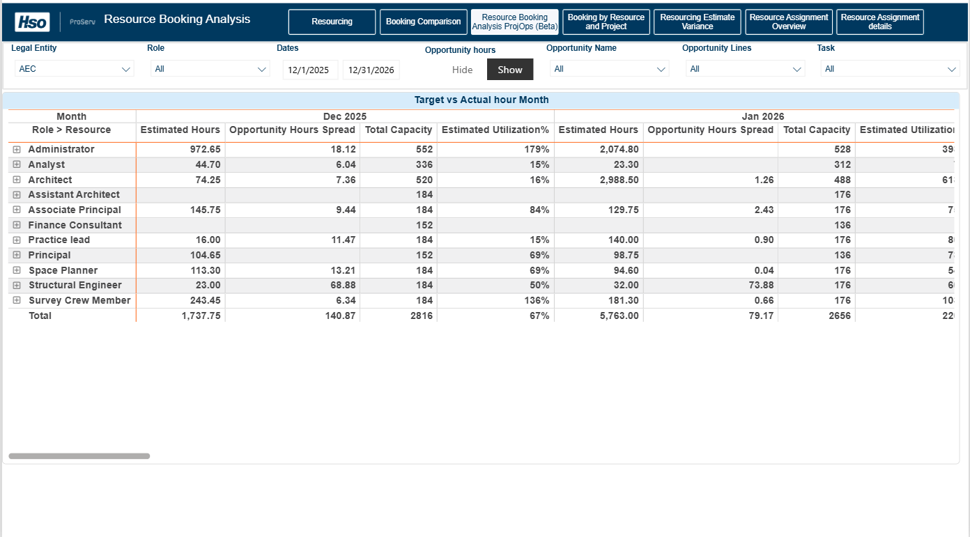 Resource Booking Analysis ProjOps (Beta): This report compares booked hours, opportunity hours, and capacity to provide visibility into current and future resource demand, along with estimated utilization by role. Opportunity hours from the Fee Estimator are time‑phased across working days based on task duration.
