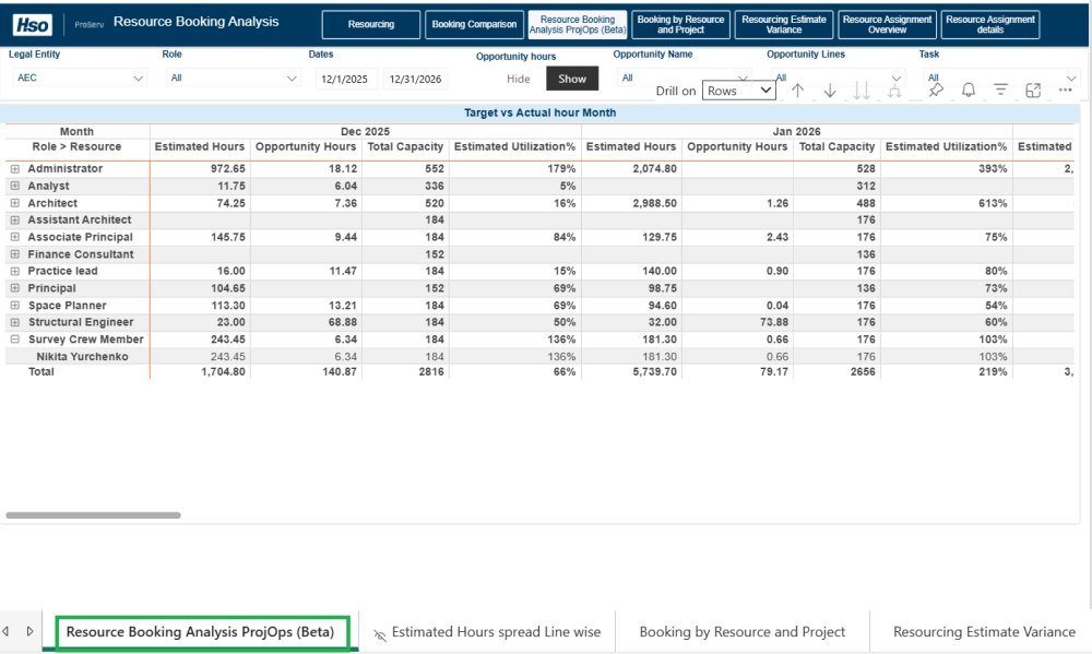 Resource Booking Analysis (Beta) now provides calendar‑based distribution of Fee Estimator opportunity hours across tasks, improving the accuracy of capacity, demand, and utilization insights.